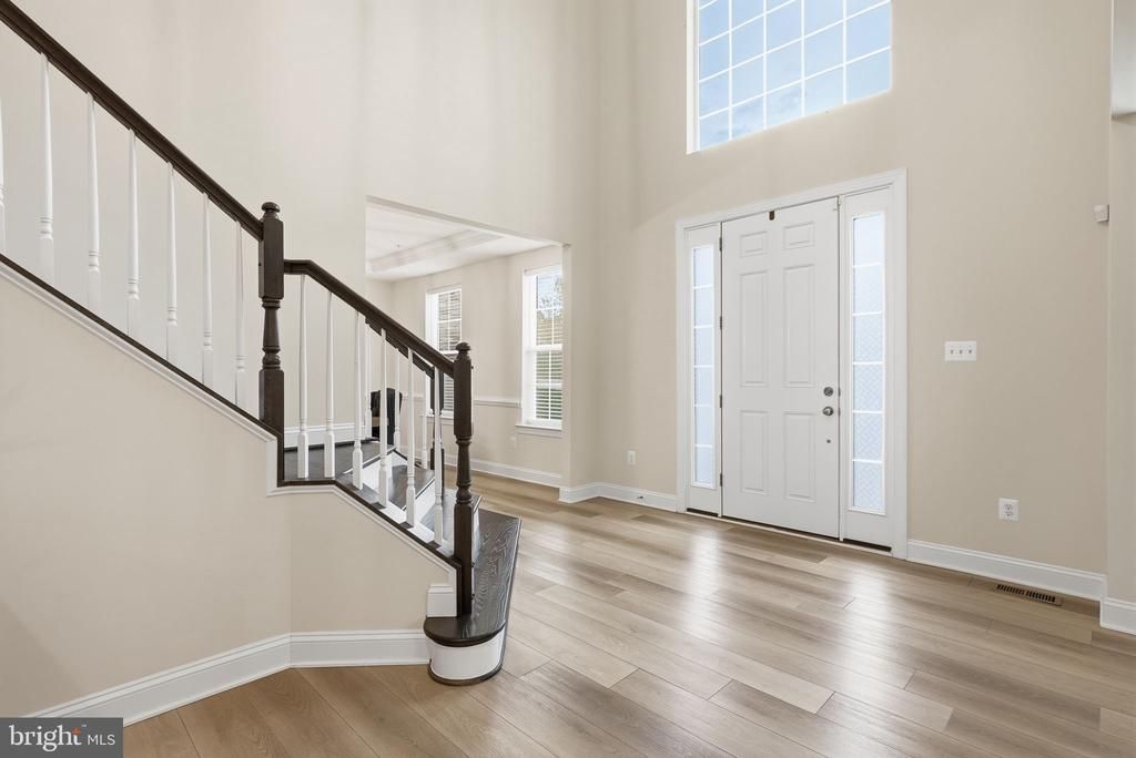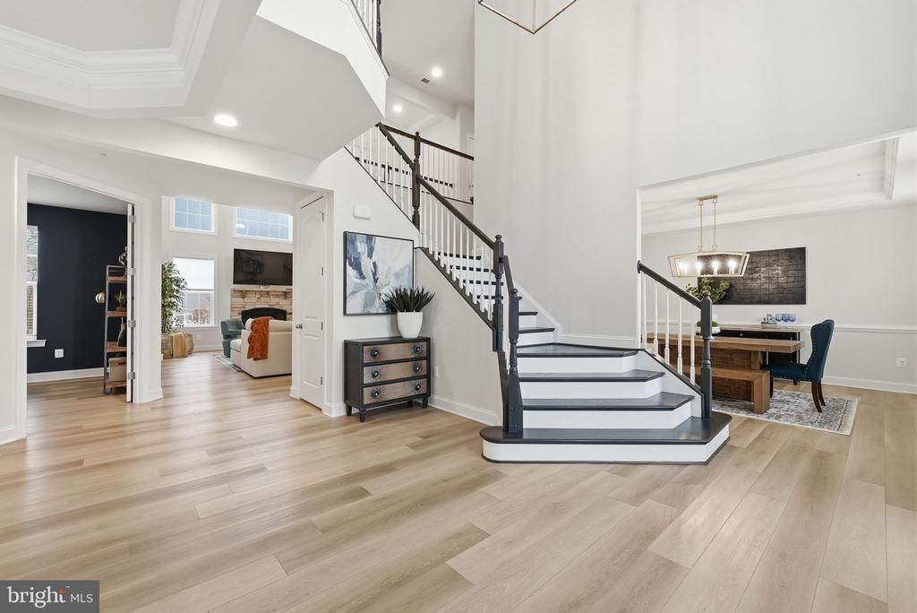 Stunning stone-front home tucked away on a quiet cul-de-sac, showcasing exceptional curb appeal with professionally landscaped grounds and elegant exterior lighting that creates a striking presence both day and night. A spacious two-car garage completes the impressive exterior. Step inside to a grand two-story foyer highlighted by a dramatic waterfall staircase with modern contrasting finishes, setting the tone for the refined design throughout. The thoughtfully designed main level features a private office, formal living room, and dining room, offering both versatility and timeless appeal for everyday living and entertaining. At the heart of the home, a breathtaking two-story family room is filled with natural light from expansive windows and anchored by a stunning fireplace. This impressive space flows seamlessly into the gourmet kitchen, creating an open and inviting layout ideal for gathering. The gourmet kitchen is designed to impress, featuring a large quartz island with seating, stainless steel appliances, custom cabinetry, and designer pendant lighting. The open-concept design connects effortlessly to the main living areas, while a custom mudroom adds both convenience and functionality. Upstairs, four spacious bedrooms include a luxurious primary suite with a tray ceiling, custom walk-in closet, and a spa-inspired bath complete with dual vanities, a soaking tub, and an upgraded walk-in shower with custom tilework and built-in seating. A secondary bedroom suite with its own full bathroom provides added flexibility, ideal for guests or extended living arrangements, while a buddy bathroom enhances convenience for additional bedrooms. The fully finished basement expands the living space with a large recreation area, dedicated exercise room, and additional storage. Outdoor living is equally impressive, featuring a stamped concrete patio with a built-in circular fire pit and raised stone seating wall, perfect for entertaining. An expansive composite deck overlooks a private wooded backdrop with mature trees, offering both privacy and tranquility, while outdoor lighting enhances the ambiance into the evening. With 9-foot ceilings on all levels, energy-efficient systems, and quality craftsmanship throughout, this home offers a perfect blend of luxury, space, and functionality in a highly desirable location near commuter routes, shopping, dining, and everyday conveniences.